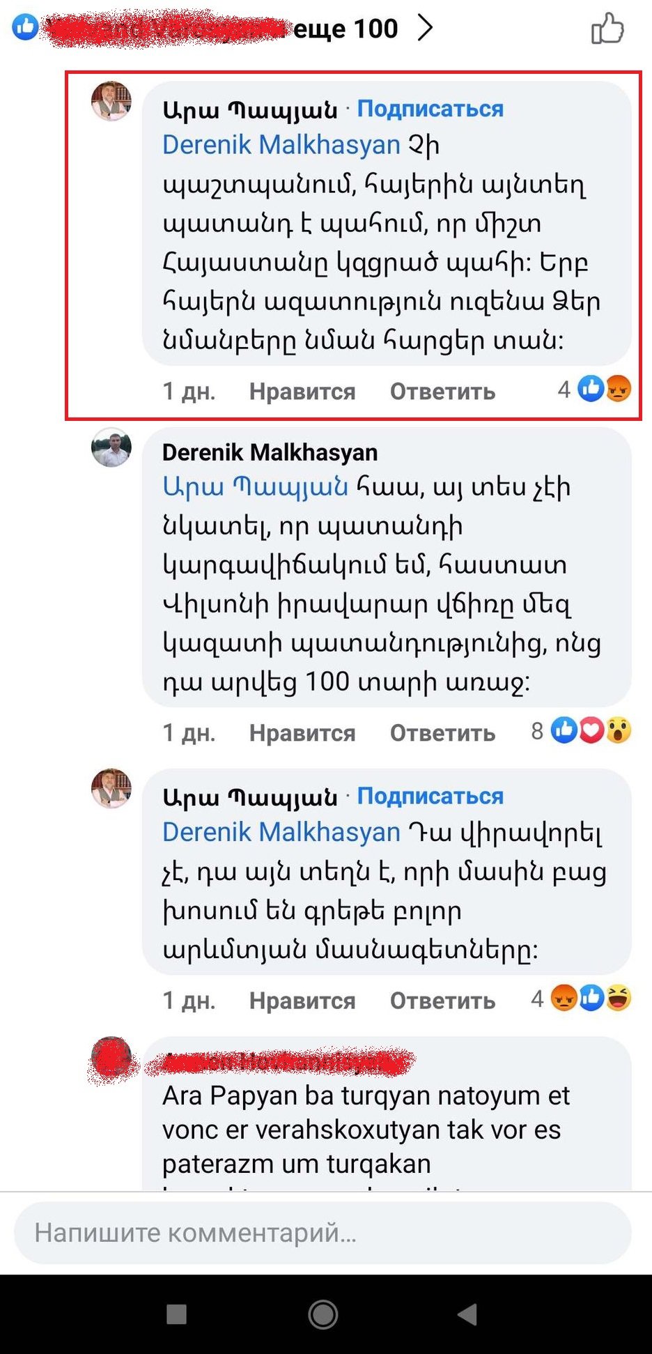 Պապանը մասնավորապես գրել է. «Չի պաշտպանում, հայերին այնտեղ պատանդ է պահում, որ միշտ Հայաստանը կզցրած պահի։ Երբ հայերն ազատություն ուզենա Ձեր նմանբերը նման հարցեր տան»: