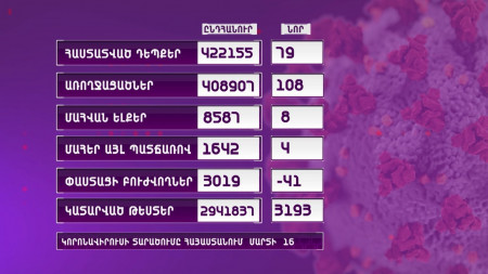 Այսպիսով, հաստատվել է կորոնավիրուսային հիվանդության ընդհանուր 422 155 դեպք, որոնցից 408 907-ը՝ առողջացած: