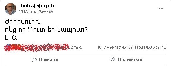 Քաղաքագետ, Հայաստանի «Քրիստոնեա-Ժողովրդավարական» կուսակցության նախագահ, արտախորհրդարանական «ընդդիմության» ներկայացուցիչների հետ Նիկոլ Փաշինյանի հանդիպումների մշտական մասնակից Լևոն Շիրինյանը ֆեյսբուքյան իր էջում անդրադարձել է Ուկրաինայում ռուսական ռազմական գործողության ընթացքին և գրել է. «Ժողովուրդ, ոնց որ Պուտլեր (ՌԴ նախագահ Վլադիմիր Պուտին–խմբ.) կապուտ»: