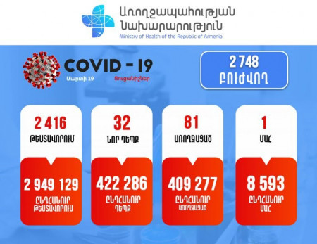 Հայաստանում արձանագրվել է կորոնավիրուսի 32 նոր դեպք, 1 մահ