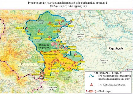 2022թ. մարտի 24-ի իրադրությունը նկարագրող քարտեզում հստակ երևում է, որ Լեռնային Ղարաբաղում ՌԴ խաղաղապահ զորախմբի պատասխանատվության գոտում ադրբեջանական հենակետեր չկան: