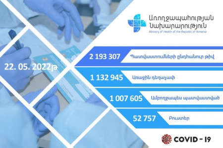 Պատվաստումային գործընթացը շարունակվում է, հայտնում է ՀՀ առողջապահության նախարարությունը: Մայիսի 22-ի դրությամբ կատարվել է՝