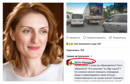 Օգտատերերից մեկը Երևանում շրջող աթաթnւրքի նկարով բեռնատարի նկարն ա տեղադրել իր էջում, ու գրել ա՝ «Արդեն Երևանում։ Է՞ս էիք ուզում», ինչին արագ արձագանքել ա ռուսաստանաբնակ մի հայ գրող՝ Նարինե Աբգարյան անունով։ Սույն տիկինը փաշինյանի հավատարիմ և անդավաճան սատարողներից ա առ այսօր։ Ինքը չի էլ հերքում դա, ուղղակի թnւրքից հեռու ապրելով ու պատերազմում կորուստ չունենալով, ինքը էնքան լկտիություն ունի, որ եկել, ու մեկնաբանություն ա գրում, որտեղ հորդորում ա սեփական պատասխանատվությունն ուրիշների վրա չգցել ու ընդունել այն իրականությունը, որը կա։ Հա, ու նաև էդ իրականության ընդունման փաստը մյուսներին փոխանցել։