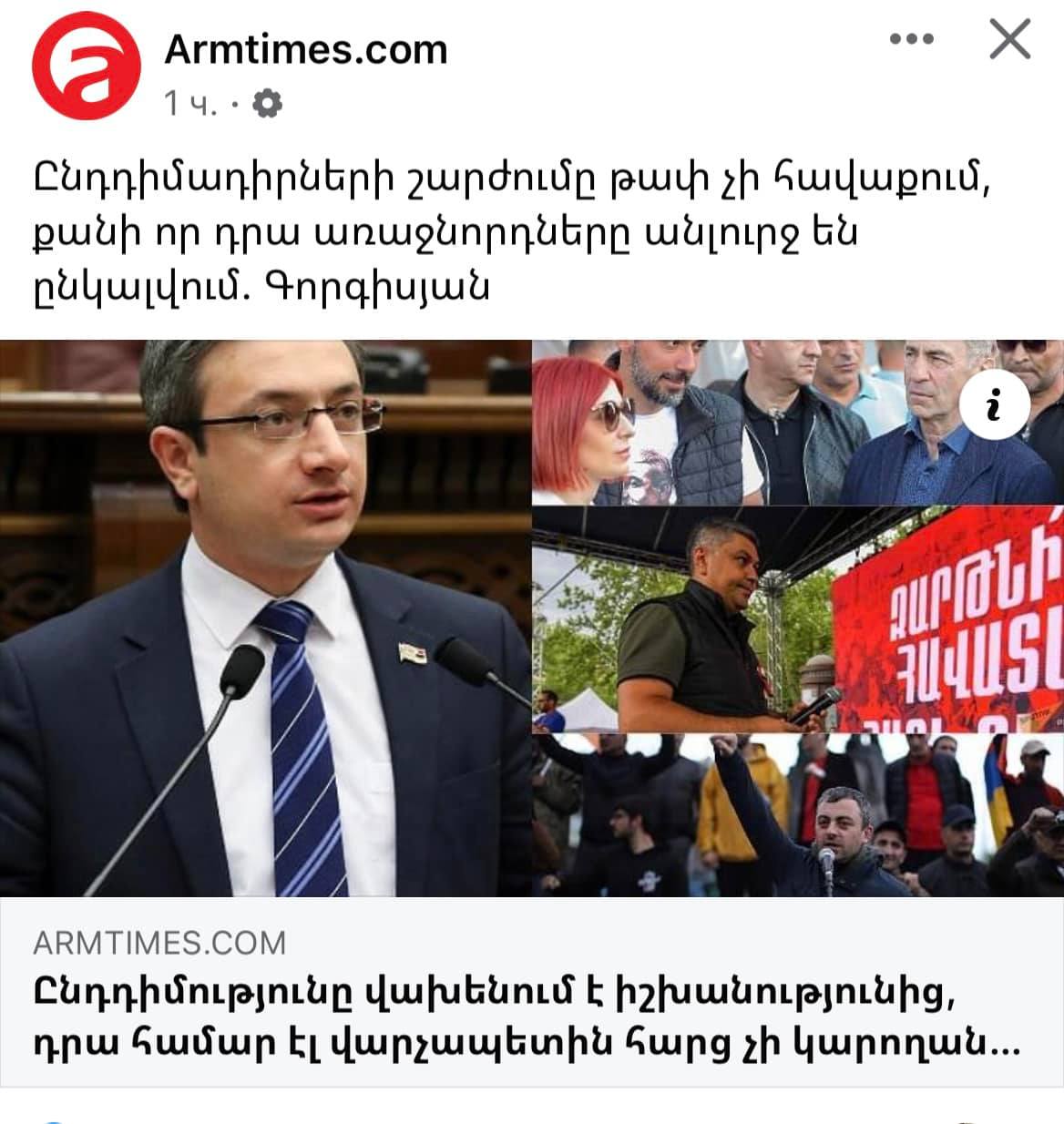 Քաղաքական դաշտի ամենաանլուրջ, իսկ արդեն լուսահոգի կուսակցության կարկառուն ներկայացուցիչ Գեւորգ Գորգիսյանն ասում է՝ ընդդիմությունը վախենում է Նիկոլ Փաշինյանին հարց տալ։ Պատկերացնո՞ւմ եք, ես ու իմ գործընկերները վախենում ենք Նիկոլին հարց տալ, ծիծաղեցիք, դե անցանք առաջ։