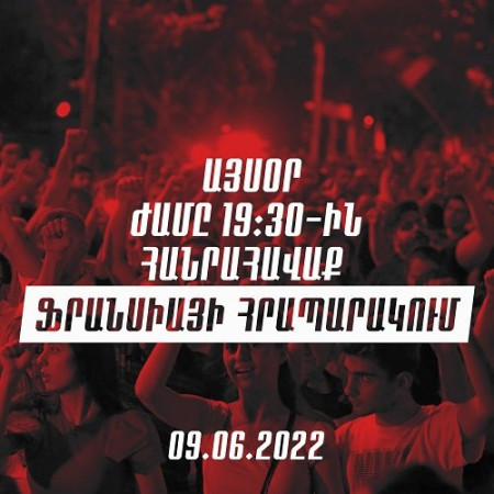 Այսօր՝ հունիսի 9-ին ժամը 19։30-ին Ֆրանսիայի հրապարակում տեղի կունենա «Դիմադրության» շարժման հանրահավաքը։