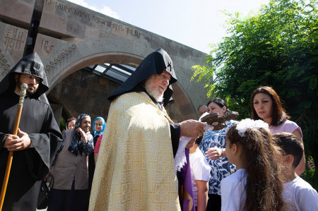 Սուրբ Շողակաթ վանքի առջև թափորը դիմավորեցին բազմաթիվ ուխտավորներ` Մայր Աթոռի Վանորեից տեսուչ Գերաշնորհ Տ. Արտակ եպիսկոպոս Տիգրանյանի գլխավորությամբ: