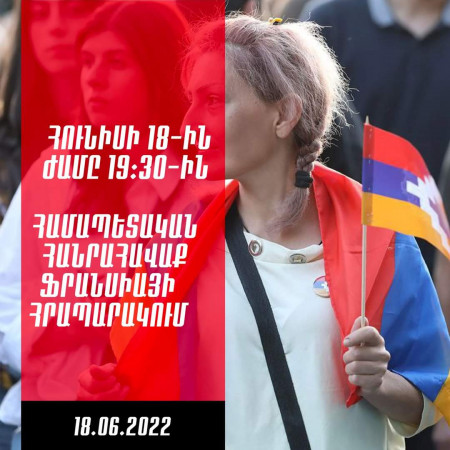 Հունիսի 18-ին, ժամը 19:30-ին Ֆրանսիայի հրապարակում տեղի կունենա համապետական հանրահավաք. Տեսանյութ 17 Հունիս, 2022 14:10 Поделиться