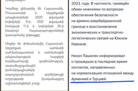 ՌԴ նախագահի պաշտոնական կայքում, ՀՀ կառավարության կայքին զուգահեռ, տեղադրվել է Փաշինյան-Պուտին հեռախոսազրույցի մասին հաղորդագրությունը։ Սակայն, ի տարբերություն ՀՀ կառավարության հաղորդագրության՝ Կրեմլի հաղորդագրության մեջ նշված է, որ երկրների ղեկավարները խոսել են նաև Հայաստան-Թուրքիա շփումների մասին։