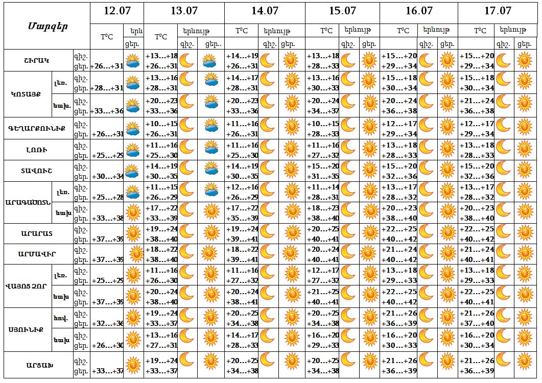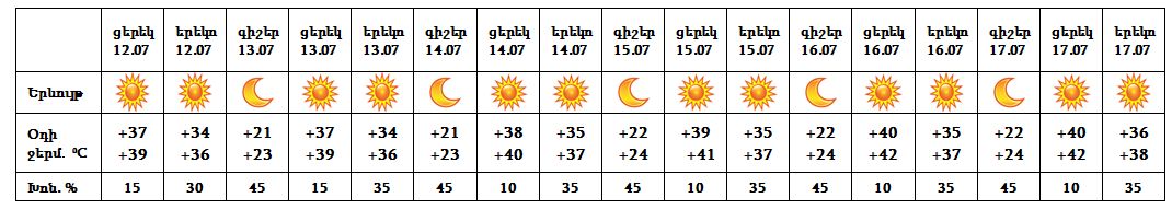 Հուլիսի 12-ի ցերեկը, 13-17-ը սպասվում է առանց տեղումների եղանակ: Երեկոյան ժամերին սպասվում է քամու ուժգնացում՝ 17-20 մ/վ արագությամբ:
