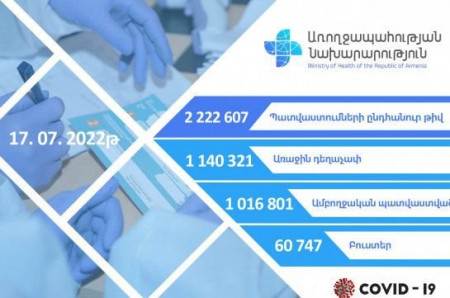 Հուլիսի 18-ի դրությամբ Հայաստանում կորոնավիրուսի դեմ պատվաստվել է 2 միլիոն 222 հազար 607 քաղաքացի