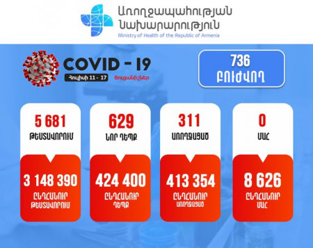 Հուլիսի 11-17-ը ՀՀ-ում կատարվել է 5681 թեստավորում, հայտնաբերվել է կորոնավիրուսի 629 նոր դեպք: Առողջացածների թիվը նույն ժամանակահատվածում կազմել է 311, մահվան դեպքեր չեն արձանագրվել: