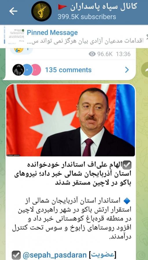 Մոտ 400 հազար բաժանորդ ունեցող «Իսլամական հեղափոխության պահապաններ» պարսկալեզու տելեգրամյան ալիքը Բաքվի բարբարոս բաշիբոզուկների՝ հայկական Բերձոր մուտքի մասին լուրը վերնագրել է հետևյալ կերպ՝ «Հյուսիսային Ադրբեջան նահանգի ինքնահռչակ նահանգապետ Իլհամ Ալիևը տեղեկացրեց. Բաքվի ուժերը հաստատվել են Բերձորում»։