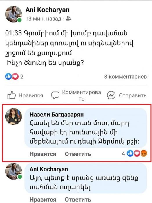 Հիմա էլ Շիրակի մարզպետ Նազելի Բաղդասարյանն ու իր հարսը՝ Անի Քոչարյանն են առաջարկում ընդդիմադիրներին ուղարկել սահման, ընդ որում տիկնայք առաջարկում են անզեն ուղարկել։ Սա ակնհայտ է դարձնում, որ նպատակը իրենց ընդդիմադիր քաղաքացիներին սպանելն է։