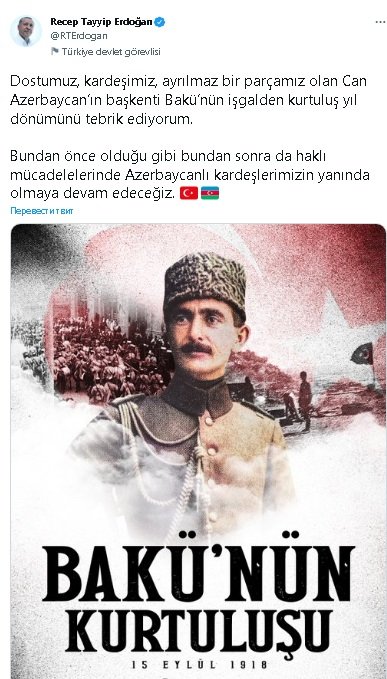 Էրդողանը հրապարակել է Նուրի Փաշայի լուսանկարը, կից գրելով. «Մենք, ինչպես նախկինում, աջակցելու ենք մեր ադրբեջանցի եղբայրներին արդար պայքարում