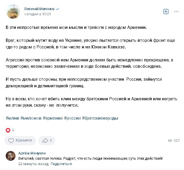 Այս բարդ ժամանակներում իմ մտքերն Հայաստանի ժողովրդի հետ են, մտահոգված եմ իրավիճակով։ Այդ մասին գրել է ՌԴ Պետդումայի պատգամավոր Վիտալի Միլոնովը: