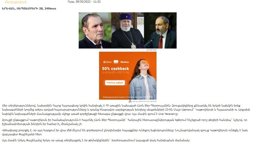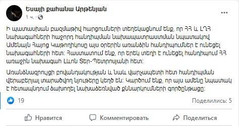 Առանձնազրույցի բովանդակության և նաև վարչապետի հետ հանդիպման վերաբերյալ տարածվող նյութերը կեղծ են։ Կարծում ենք, որ այս ամենը նպատակ է հետապնդում ձախողել նախաձեռնված քննարկումների գործընթացը», - նշել է նա։