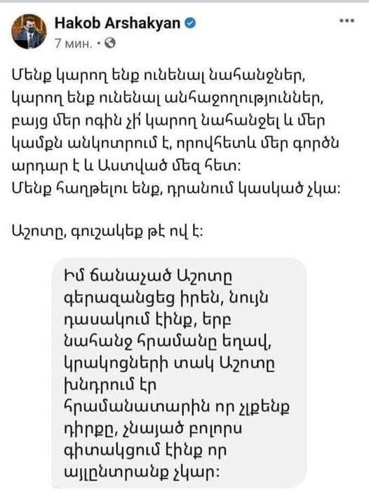 Վազգեն Սաղաթելյանը ֆեյսբուքյան իր էջում գրում է․