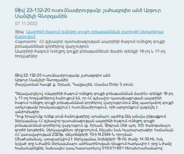 «Ազդարար» պաշտոնական հայտարարությունների կայքից տեղեկանում ենք, որ ՀՀ գլխավոր դատախազության ապօրինի ծագում ունեցող գույքի բռնագանձման գործերով վարչությունը ծանուցումներ է ուղարկել Աննա Վլադիմիրի Գասպարյանին և Արթուր Սամվելի Գևորգյանին: