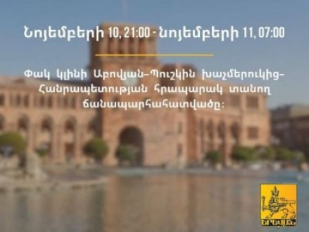 Մայրաքաղաքի ամանորյա տոնական ձևավորման աշխատանքներով պայմանավորված՝ նոյեմբերի 10-ին ժամը 21:00-ից մինչև նոյեմբերի 11-ի 07:00-ն, փակ կլինի Աբովյան-Պուշկին խաչմերուկից Հանրապետության հրապարակ տանող ճանապարհահատվածը: