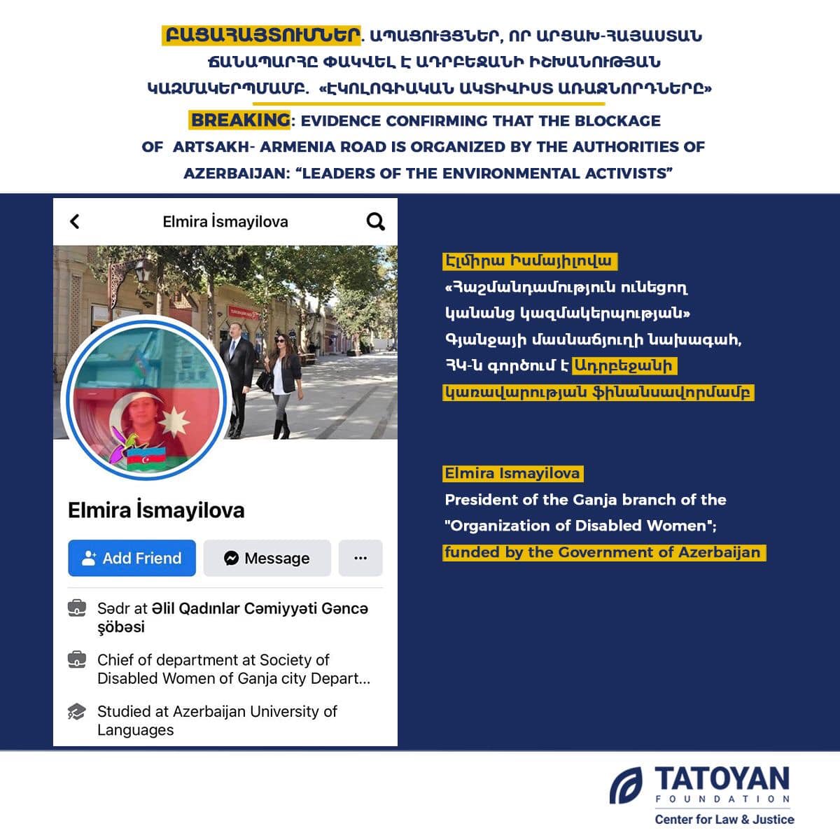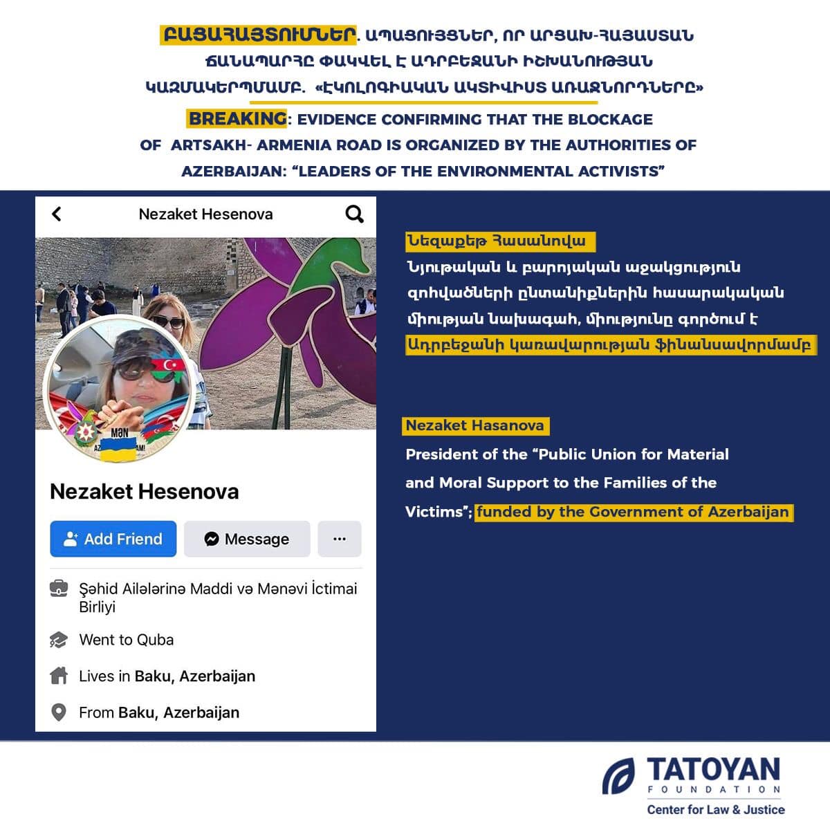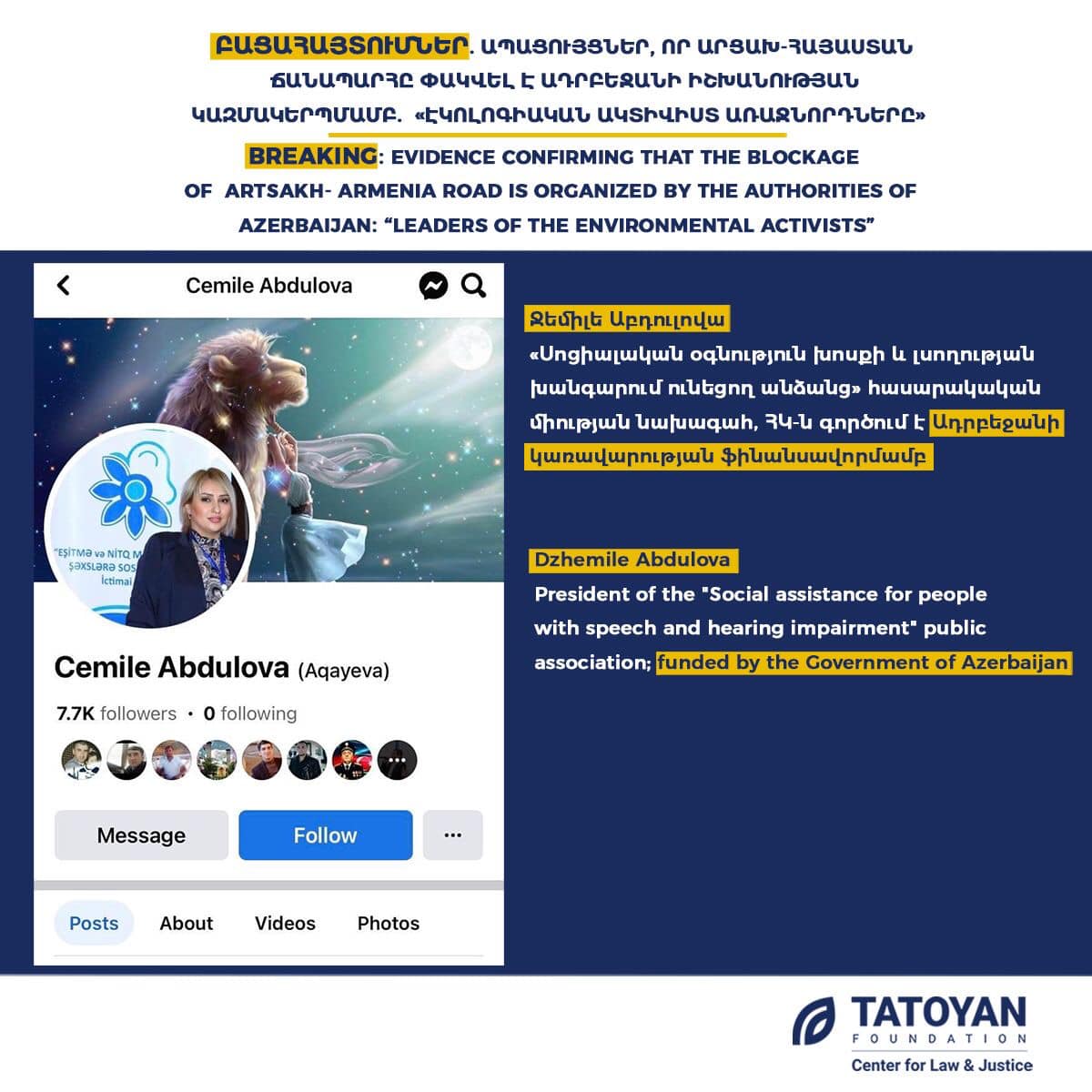 Արցախ-Հայաստան ճանապարհը փակած ադրբեջանական «բնապահպան ակտիվիստ առաջնորդներն» ուղիղ ֆինանսավորվում են Ադրբեջանի կառավարությունից կամ իշխանությունների հետ առնչություն ունեցող կազմակերպություններից։ Այս եզրահանգմանն է եկել Իրավունքի և արդարության կենտրոն «Թաթոյան» հիմնադրամում ստեղծված աշխատանքային խումբը՝ մասնագիտական վերլուծության ենթարկելով Արցախ-Հայաստան ճանապարհը փակած ադրբեջանական էկոակտիվիստ առաջնորդների վերաբերյալ փաստական տվյալները։