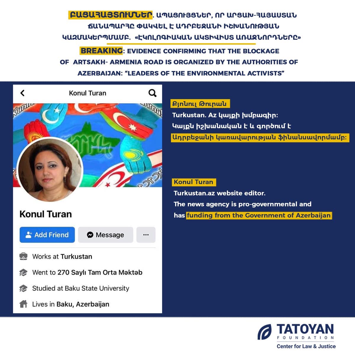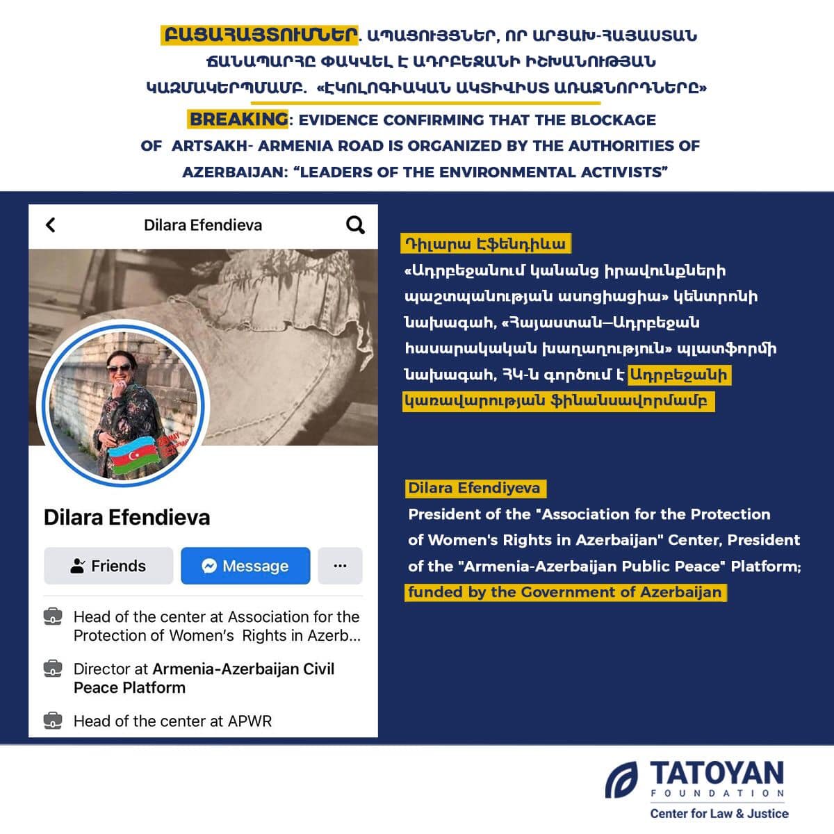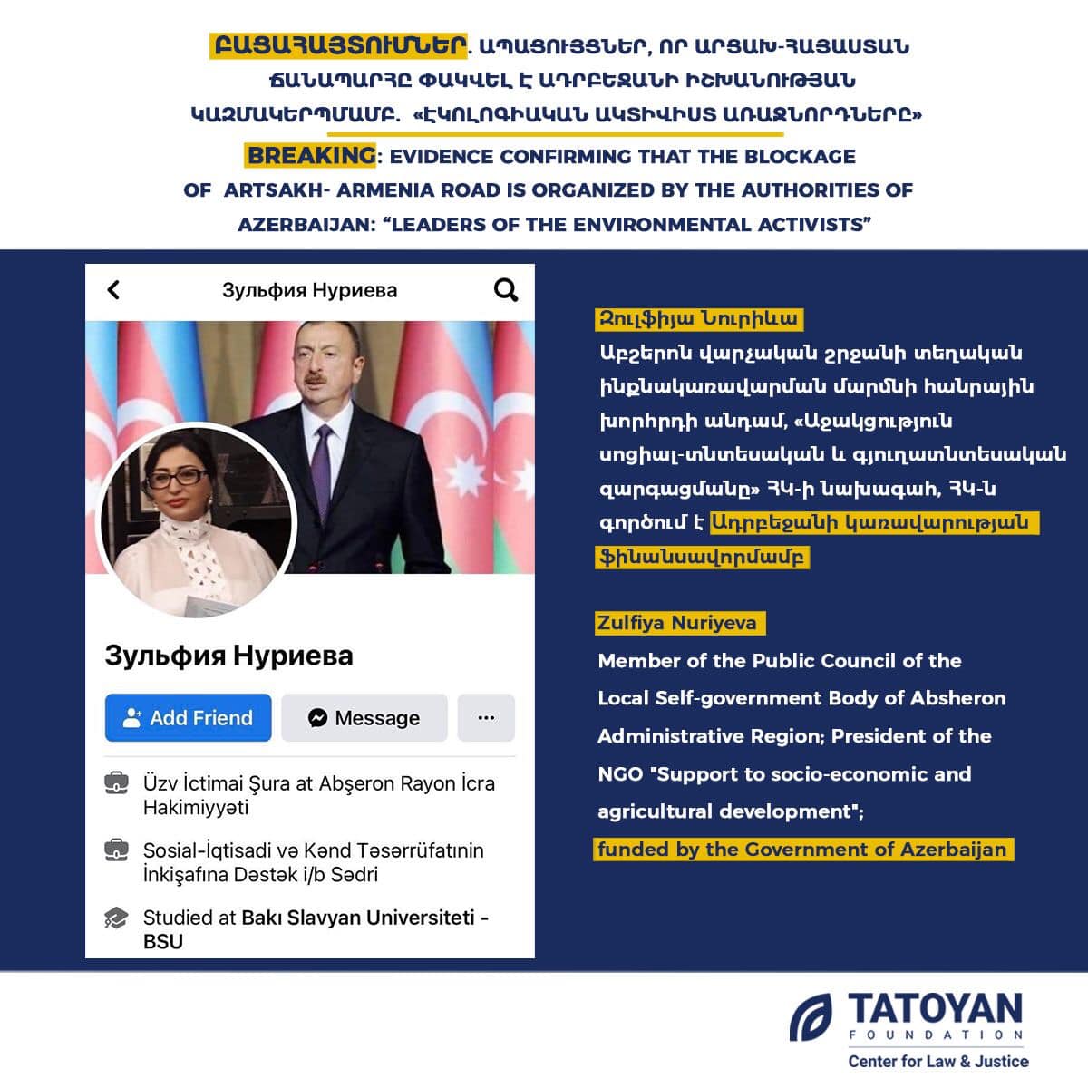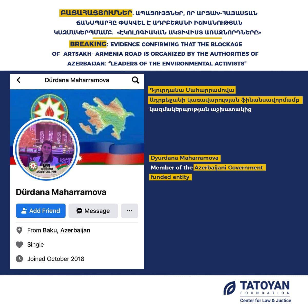 Արցախ-Հայաստան ճանապարհը փակած ադրբեջանական «բնապահպան ակտիվիստ առաջնորդներն» ուղիղ ֆինանսավորվում են Ադրբեջանի կառավարությունից կամ իշխանությունների հետ առնչություն ունեցող կազմակերպություններից։ Այս եզրահանգմանն է եկել Իրավունքի և արդարության կենտրոն «Թաթոյան» հիմնադրամում ստեղծված աշխատանքային խումբը՝ մասնագիտական վերլուծության ենթարկելով Արցախ-Հայաստան ճանապարհը փակած ադրբեջանական էկոակտիվիստ առաջնորդների վերաբերյալ փաստական տվյալները։