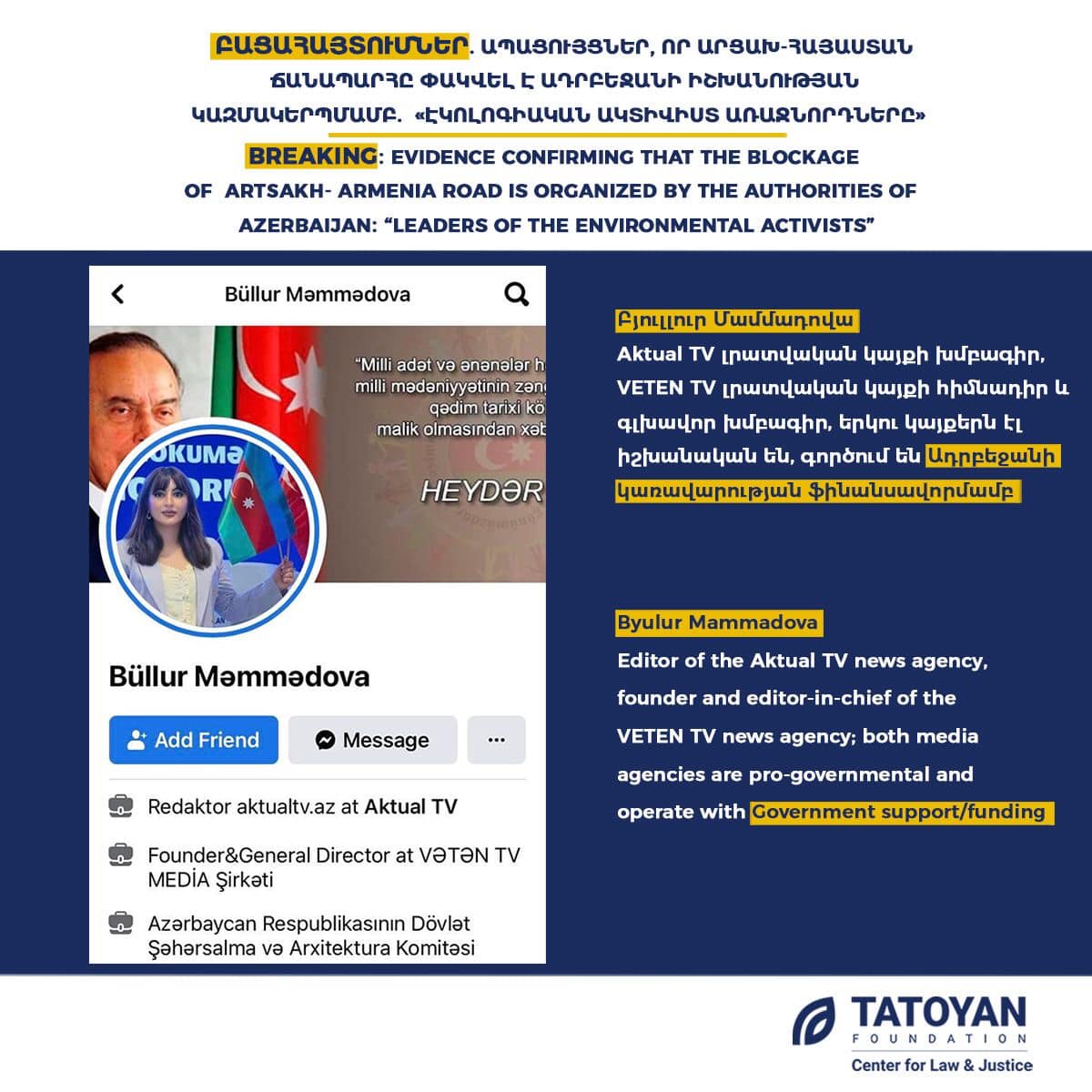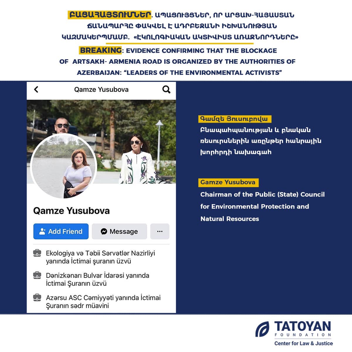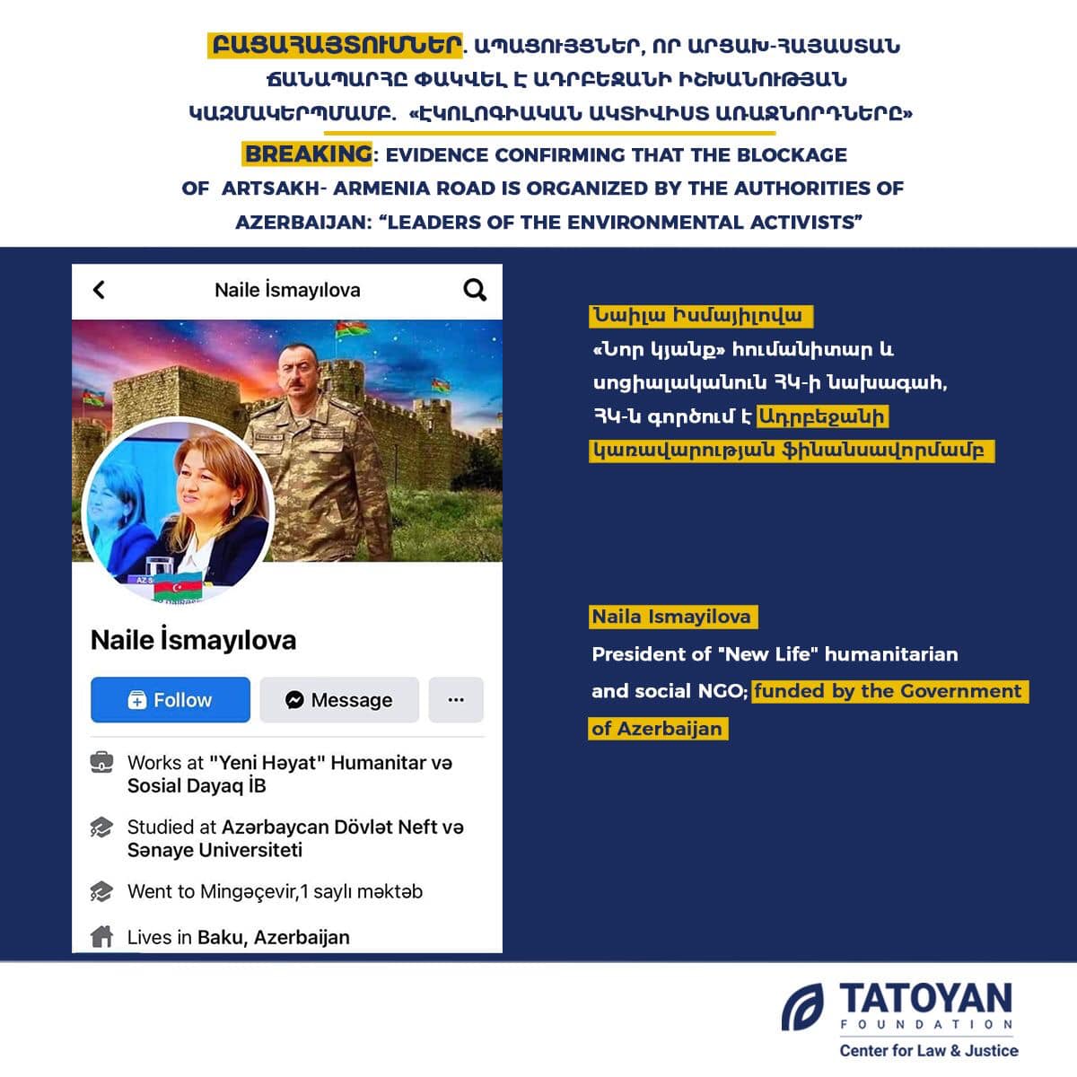 Բացի այդ, վերլուծությունները ցույց են տալիս, որ Արցախ-Հայաստան ճանապարհը փակած ադրբեջանական «բնապահպան ակտիվիստ առաջնորդներն» իրենց սոցցանցերի էջերում առանձնակի ջանասիրությամբ են տարածում Ալիևների ընտանիքին վերաբերող տեղեկությունները, լուսանկարները, անում են հակահայկական ու հայատյաց գրառումներ, քարոզ։ Բայց գլխավոր հարցն այն է, որ նրանք ապահովում են ադրբեջանական կառավարական քաղաքականությունը։
