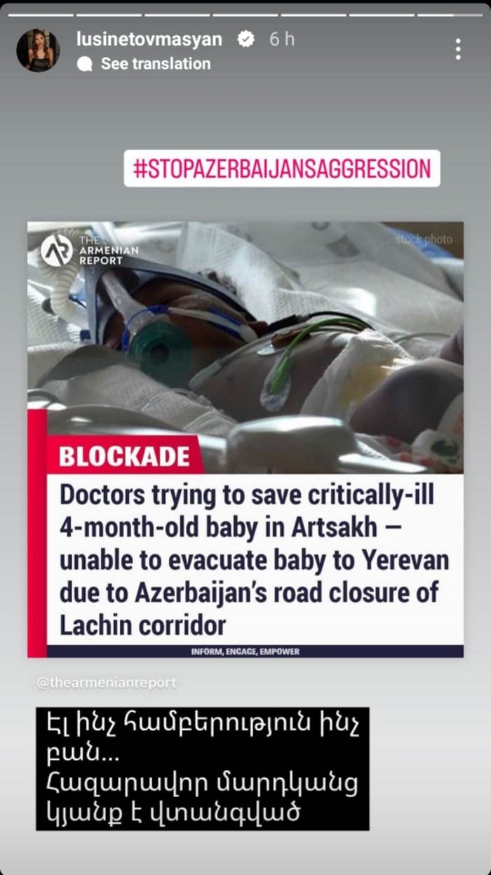 Գեղեցկուհի եւ հաղորդավարուհի Լուսինե Թովմասյանն իր ինստագրամյան էջի Stories բաժնում անդրադարձել է Արցախի շրջափակման հետեւանքներին: