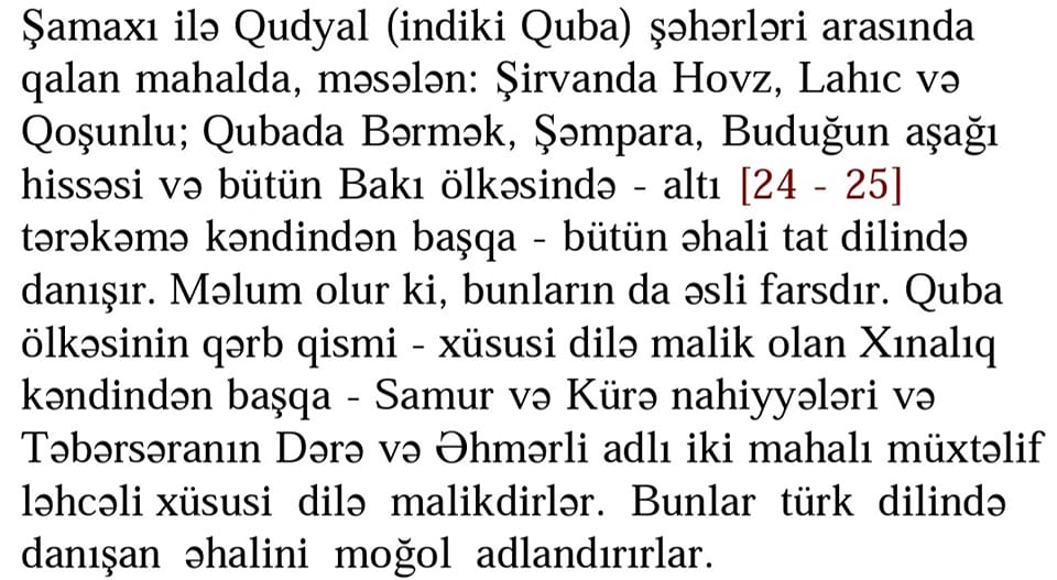Դիցուք, ադրբեջանական պատմագրության հայր Աբբաս-ղուլի Աղա Բաքիխանովը գրում է՝ «Շամախի հետ Ղուդիալ (այժմյան՝ Ղուբա) քաղաքների միջև ընկած շրջանում, օրինակ՝ Շիրվանում Հովզ, Լահիջ և Ղոշունլու, Ղուբայում Բարմաք, Շամփարա, Բուդուղի ստորին հատվածում և Բաքվի ամբողջ երկրամասում, բացի թարաքամայական վեց գյուղերից, ամբողջ բնաչությունը խոսում է թաթերենով (թարգմ.՝ կովկասյան պարսկերենով)։ Հայտնի է դառնում, որ սրանց ծագումը պարսկական է»։