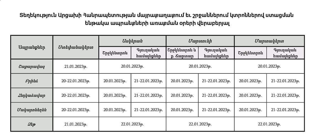 Արցախի Հանրապետության գյուղի և գյուղատնտեսության աջակցության հիմնադրամը տեղեկացնում է, որ ըստ կտրոնների տրամադրվող ապրանքատեսակները քաղաքացիները կարող են ձեռք բերել հունվարի 20-ից մայրաքաղաքի և շրջանների բոլոր խանութներից։