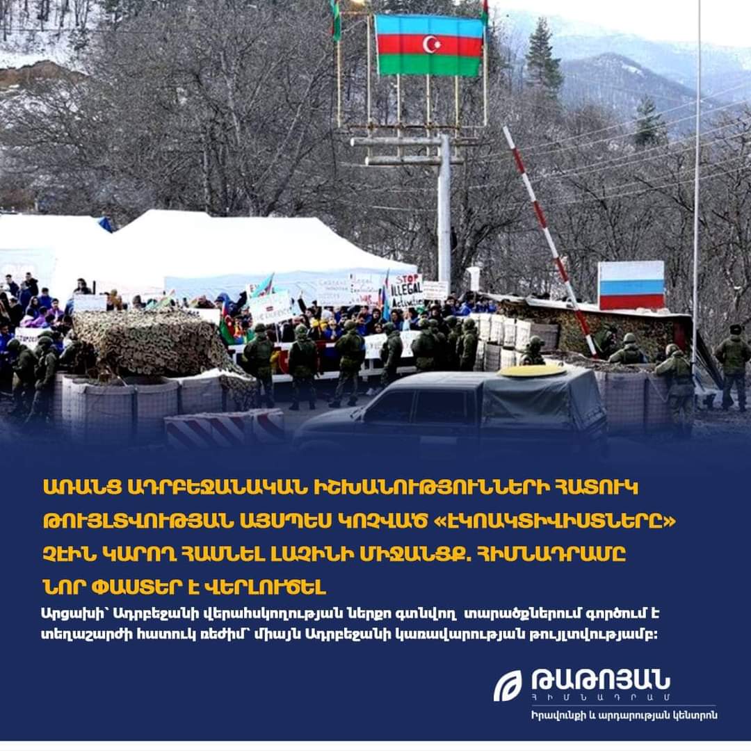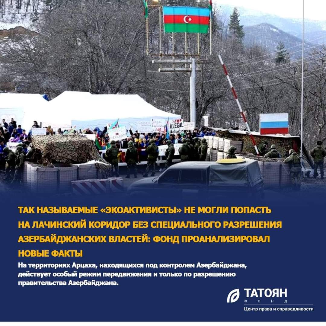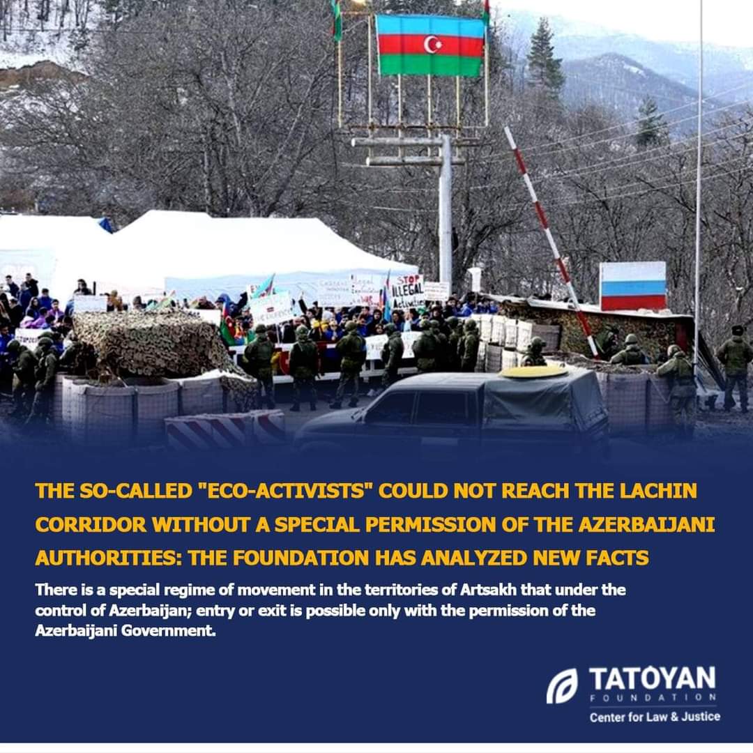 44-օրյա պատերազմի հետևանքով Ադրբեջանի վերահսկողության տակ անցած տարածքներ քաղաքացիների մուտքը և ելքը կանոնակարգված է ադրբեջանական օրենսդրությամբ, հետևաբար Արցախը Հայաստանին կապող միակ ճանապարհն ապօրինի արգելափակած «ակտիվիստների» տեղաշարժը չէր կարող լինել առանց ադրբեջանական իշխանությունների թույլտվության։ Այս մասին են վկայում Իրավունքի և արդարության կենտրոն «Թաթոյան» հիմնադրամի ուսումնասիրությունները, որոնք հիմնված են Ադրբեջանի նախագահի 2020 թ․ հոկտեմբերի 29-ին ստորագրած հրամանագրի վրա։