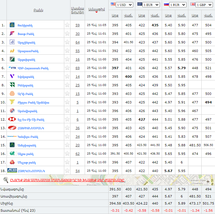 Rate.am-ը ներկայացրել է հունվարի 25-ի դրությամբ տարադրամի փոխարժեքը։ ԱՄՆ դոլարի առքը միջինը 394.58դրամ է, վաճառքը՝ 403.50 դրամ:
