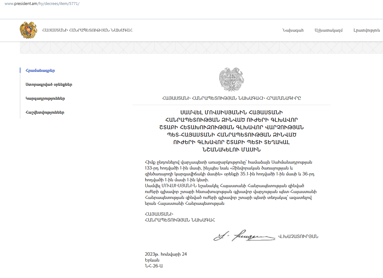 «Սամվել ՄՈՎՍԻՍՅԱՆԻՆ նշանակել Հայաստանի Հանրապետության զինված ուժերի գլխավոր շտաբի հետախուզության գլխավոր վարչության պետ-Հայաստանի Հանրապետության զինված ուժերի գլխավոր շտաբի պետի տեղակալ՝ ազատելով նրան Հայաստանի Հանրապետության...»։