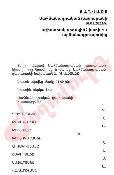 Արդյունքում երեկ՝ փետրվարի 10-ին, «Ժողովուրդ» օրաթերթը ՍԴ լրատվական ծառայությունից պաշտոնապես ստացավ Սեդա Սաֆարյանի աշխատակարգային նիստում իր կողմից արված խոստովանության պաշտոնական արձանագրությունը: Ներկայացնում ենք ՍԴ դատավոր Սեդա Սաֆարյանի խոստովանության փաստաթուղթը՝ լուսանկարով: