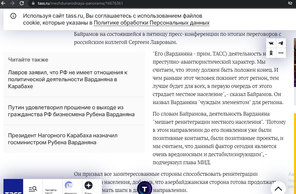 1. Բաքուն առաջին անգամ չէ, որ ասում է, որ «Վարդանյանը պետք է լքի Արցախի տարածքը», ինչը, իբր, կարող է նպաստել Բաքվի և Ստեփանակերտի միջև շփումներին: Այս մասին, մասնավորապես, հայտարարել է Ադրբեջանի արտգործնախարար Ջեյհուն Բայրամոնը 2022 թվականի դեկտեմբերին։