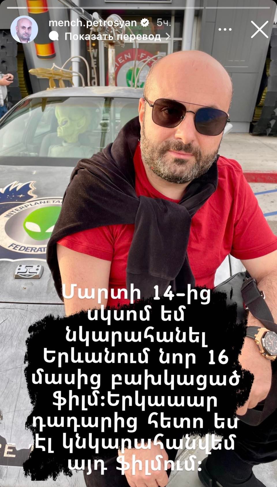 Նա հրապարակել է լուսանկար, որին կից գրել է. «Մարտի 14-ից սկսում եմ նկարահանել Երևանում 16 մասից բաղկացած ֆիլմ: Երկար դադարից հետո հետո ես էլ կնկարահանվեմ այդ ֆիլմում»: