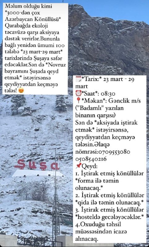 Լեռնային Ղարաբաղի ադրբեջանական շրջափակման 100-րդ օրն է, և Ադրբեջանի կառավարությանն ավելի շատ մարմիններ են պետք՝ շարունակելու Լաչինի միջանցքի արգելափակումը։ Այս մասին Twitter-ի իր էջում գրել է ամերիկացի լրագրող Լինդսի Սնելը։ «Մարտի 23-29-ը հավաքագրում են ուսանողների.