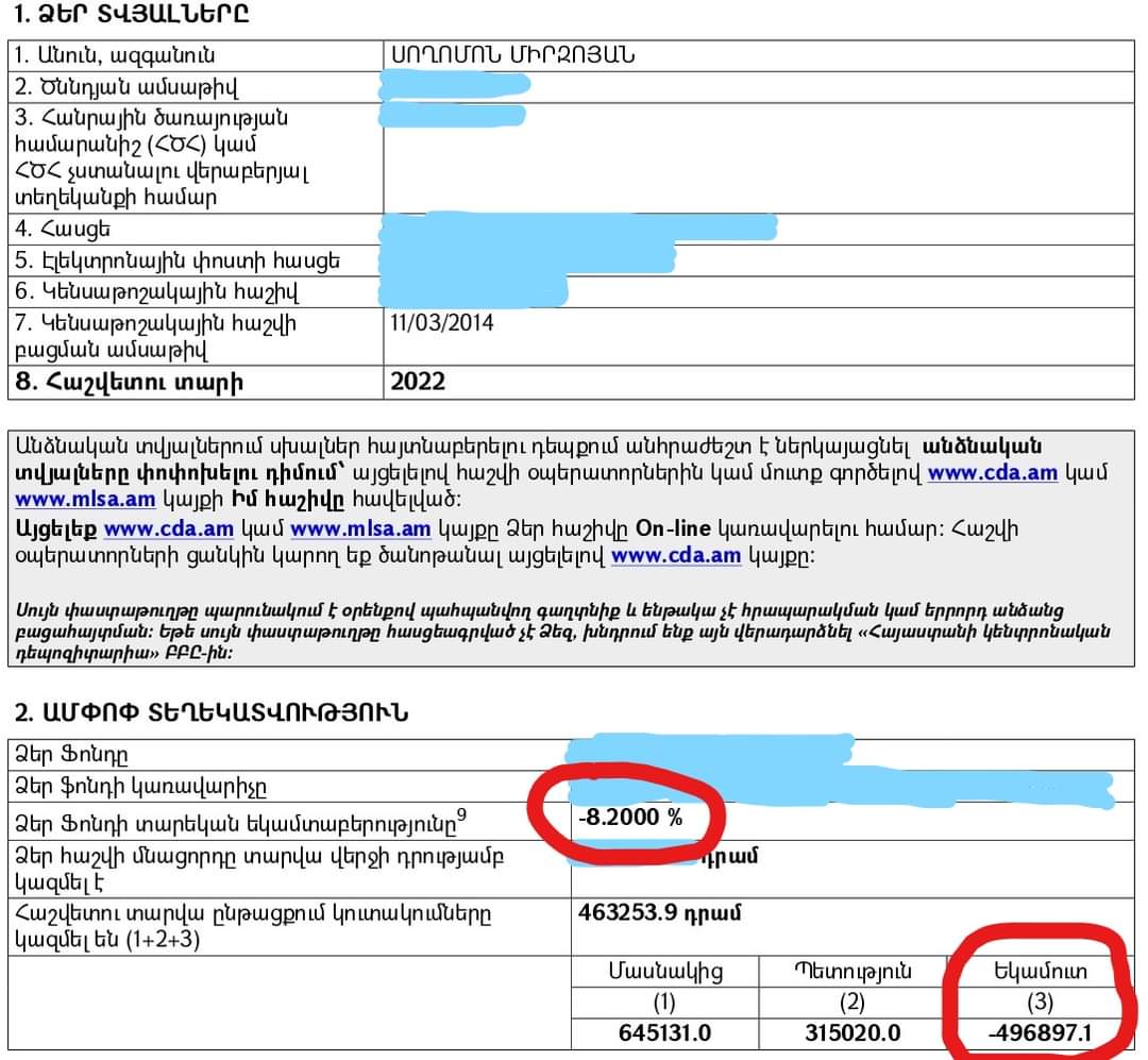 1. Կուտակային կենսաթոշակային ֆոնդի 2 կառավարիչներն էլ մեր միջոցները կառավարում են անարդյունավետ: Մասնավորապես, ֆոնդի կառավարչից ինձ ներկայացված իմ անձնական 2022թ. տարեկան հաշվետվության մեջ արձանագրված է «-496897 դրամ եկամուտ», կամ որ նույնն է՝ վնաս, իսկ տարեկան եկամտաբերությունը կազմել է «-8,2%»: Այսինքն, այդքան չափով կորուստ եմ ունեցել: