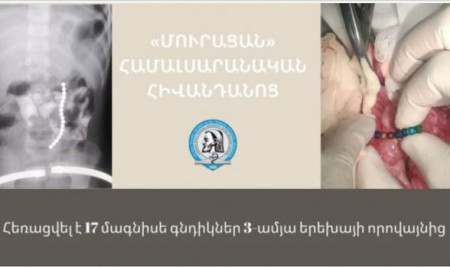 3-ամյա երեխայի որովայնից հեռացվել է 17 մագնիսե գնդիկ․ Այս մասին հայտնում են «Մուրացան» համալսարանական հիվանդանոցից։ «3 տարեկան երեխայի ծնողները դիմել են «Մուրացան» համալսարանական հիվանդանոց՝ նշելով, որ երեխան խաղալիս է եղել մագնիսե գնդիկներով, իսկ որոշ ժամանակ անց նկատել են դրանց մեծ մասի բացակայությունը: Համալսարանական կլինիկայում կատարվել է վիրաբույժի զննում. որովայնը եղել է պալպատոր փափուկ, փսխում չի դիտվել, գանգատներ չի նշվել: