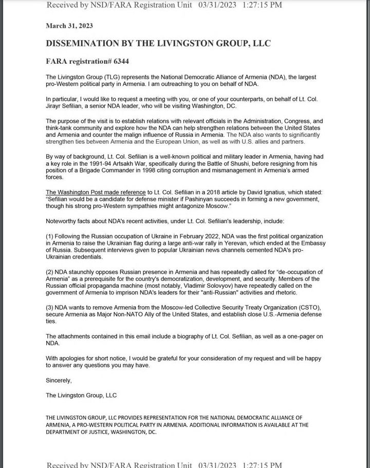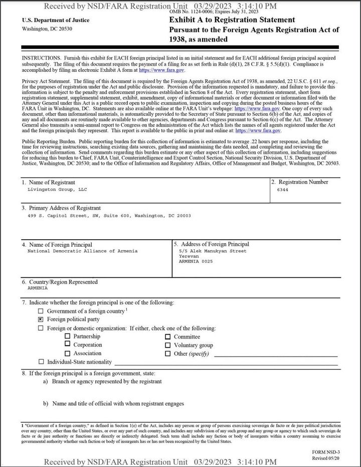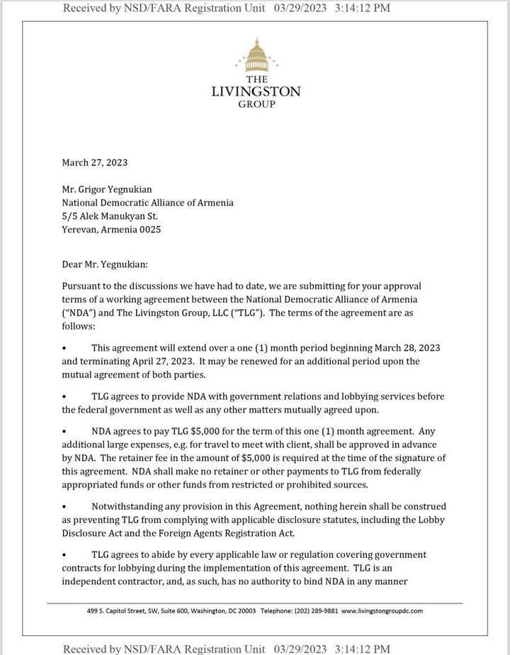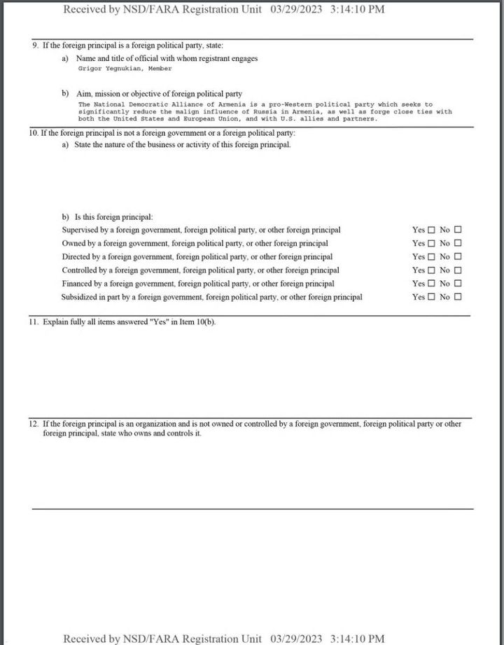 Ազգային-ժողովրդավարական բևեռը FARA-ի օրենքի (Foreign Agents Registration Act) շրջագծում ԱՄՆ-ում օրինական գործունեություն ծավալելու համար գրանցման դիմում է ներկայացրել ԱՄՆ-ի արդարադատության դեպարտմենտին: