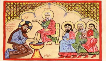 Քրիստոս վերջին ընթրիքից հետո, ցուցաբերելով ճշմարիտ հեզության ու խոնարհության օրինակ, լվանում է Իր աշակերտների ոտքերը: