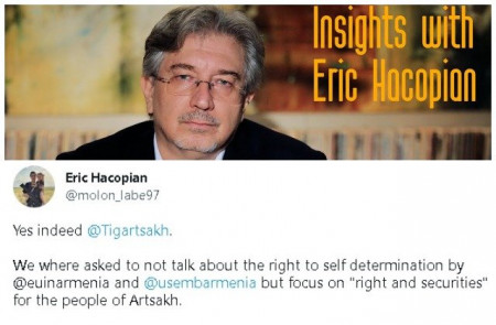 «Հայաստանում ԱՄՆ դեսպանատնից ու Հայաստանում Եվրոմիության գրասենյակից մեզ ասել են չխոսել Արցախի ինքնորոշման իրավունքից, այլ միայն «իրավունքից և անվտանգությունից»»։