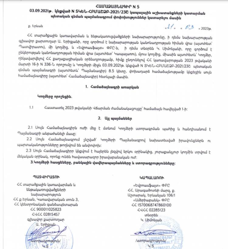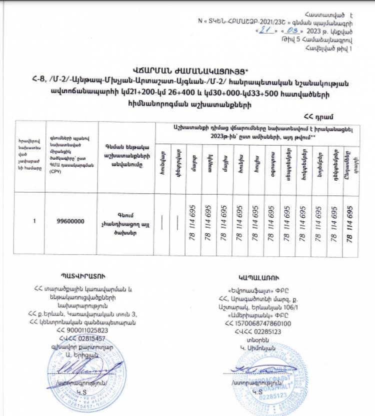 Գնում չհանդիսացող ծախս «ընթացակարգով» Տարածքային կառավարման եւ ենթակառուցվածքների նախարարությունը 23 օր առաջ մոտ 79 միլիոն դրամի համաձայնագիր է կնքել Կառլեն Սիմոնյանի ընկերության հետ՝ Այնթապ-Մխչյան-Արտաշատ-Այգևան ավտոճանապարհի հիմնանորոգման համար։