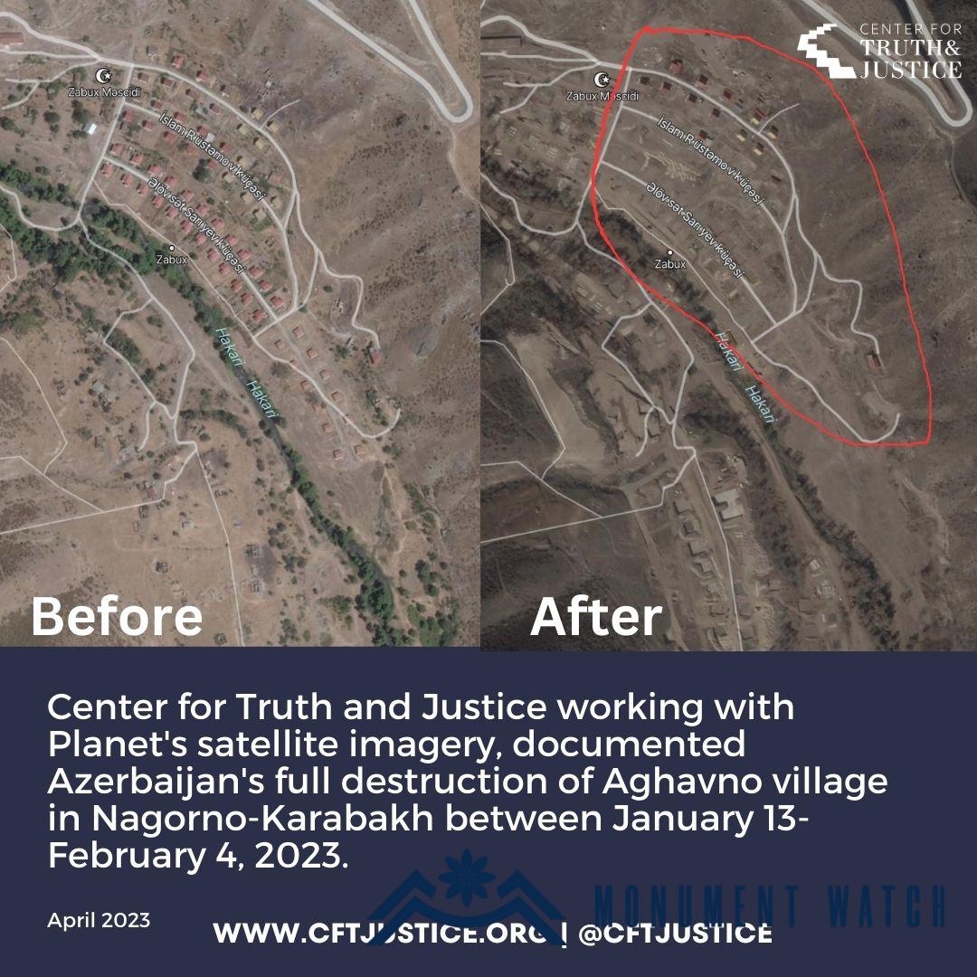 «2023 թվականի ապրիլի 5-ին «Ճշմարտության և արդարության կենտրոնի» /Center for Truth and Justice/ Թվիթերում տարածած արբանյակային լուսանկարից երևում է, որ ադրբեջանցիները հիմնահատակ քանդել են Քաշաթաղի շրջանի Աղավնո գյուղի բնակելի թաղամասի տների մեծ մասը: Գյուղը նոյեմբերի 9-ի ստորագրված եռակողմ հայտարարությունից հետո շարունակում էր գտնվել հայկական վերահսկողության տակ։