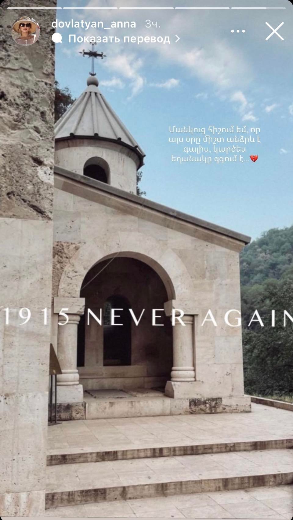 Հայոց ցեղասպանության 108-րդ տարելիցի կապակցությամբ դերասանուհի Աննա Դովլաթյանը հրապարակել է եկեղեցու լուսանկար, որին կից գրել է. «Մանկուց հիշում եմ, որ այս օրը միշտ անձրևէ գալիս, կարծես եղանաը զգում է»: