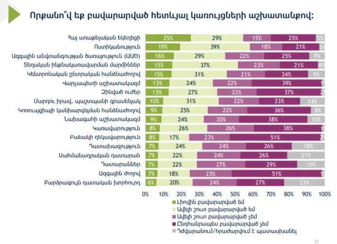 Երրոդ հորիզոնականում ԱԱԾ-ն է, որի աշխատանքով լիովին բավարարված է հարցվածների 16 տոկոսը, ավելի շուտ բավարարված է 29 տոկոսը, ավելի շուտ բավարարված չէ 22 տոկոսը, ընդհանրապես բավարարված չէ 25 տոկոսը, 9 տոկոսը դժվարացել է պատասխանել։