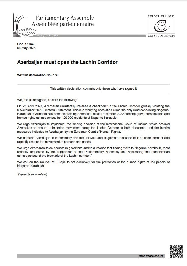 Խորհրդարանականները հորդորել են Ադրբեջանին անհապաղ կատարել պարտադիր ուժ ունեցող ՄԻԵԴ-ի միջանկյալ միջոցները ու Արդարադատության միջազգային դատարանի որոշումը, որը պարտավորեցնում է Ադրբեջանին երկկողմանի անխոչընդոտ տեղաշարժ ապահովել Լաչինի միջանցքով: Այս մասին հայտնում են եվրոպայի խորհրդում հայաստանի մշտական ներկայացուցչությունից։