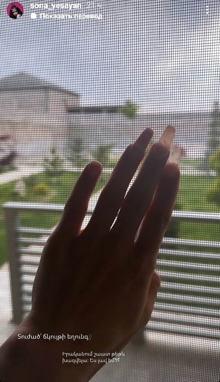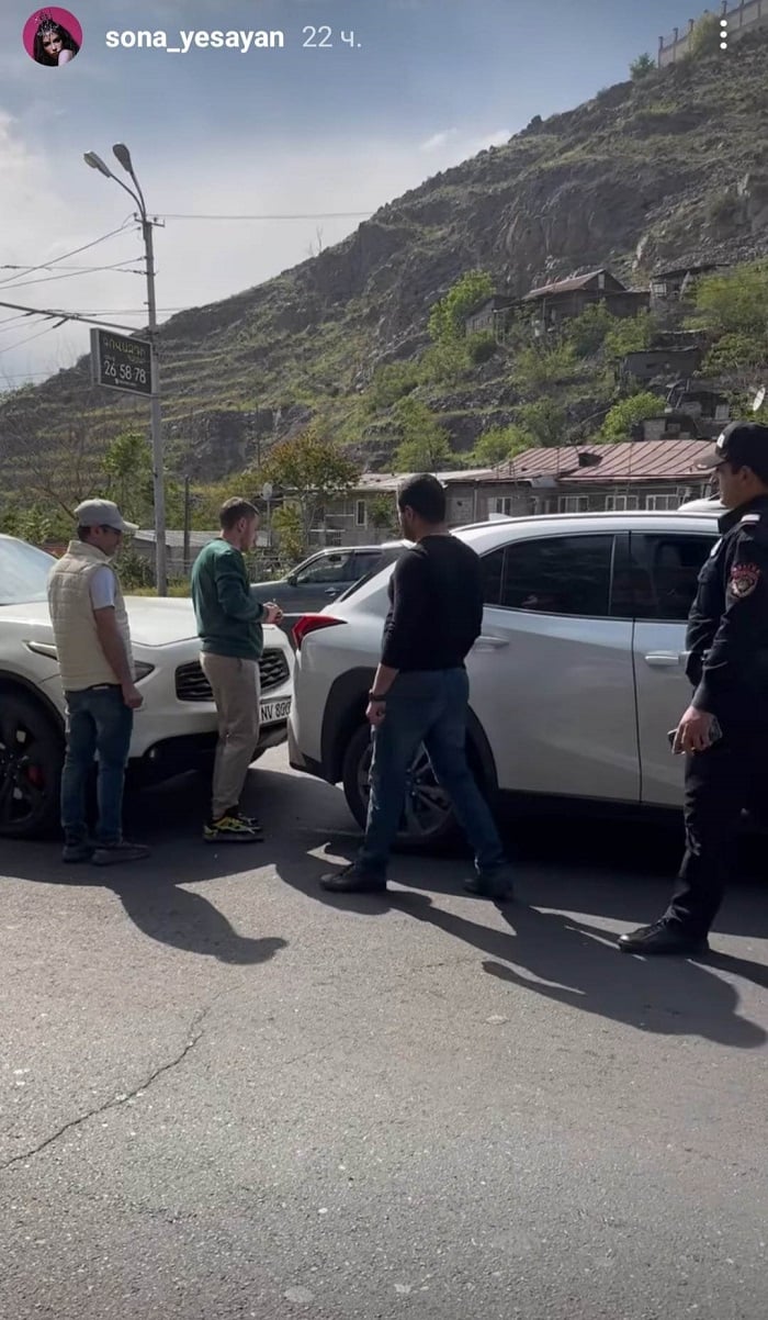 Տեղադրված կադրերից մեկում երեւում է վթարը։ «Տուժած՝ ճկույթի եղունգ։ Իրականում շատ թեթեւ խազվել ա։ Ես լավ եմ», – հրապարակումներից մեկը մեկնաբանել է Սոնա Եսայանը։