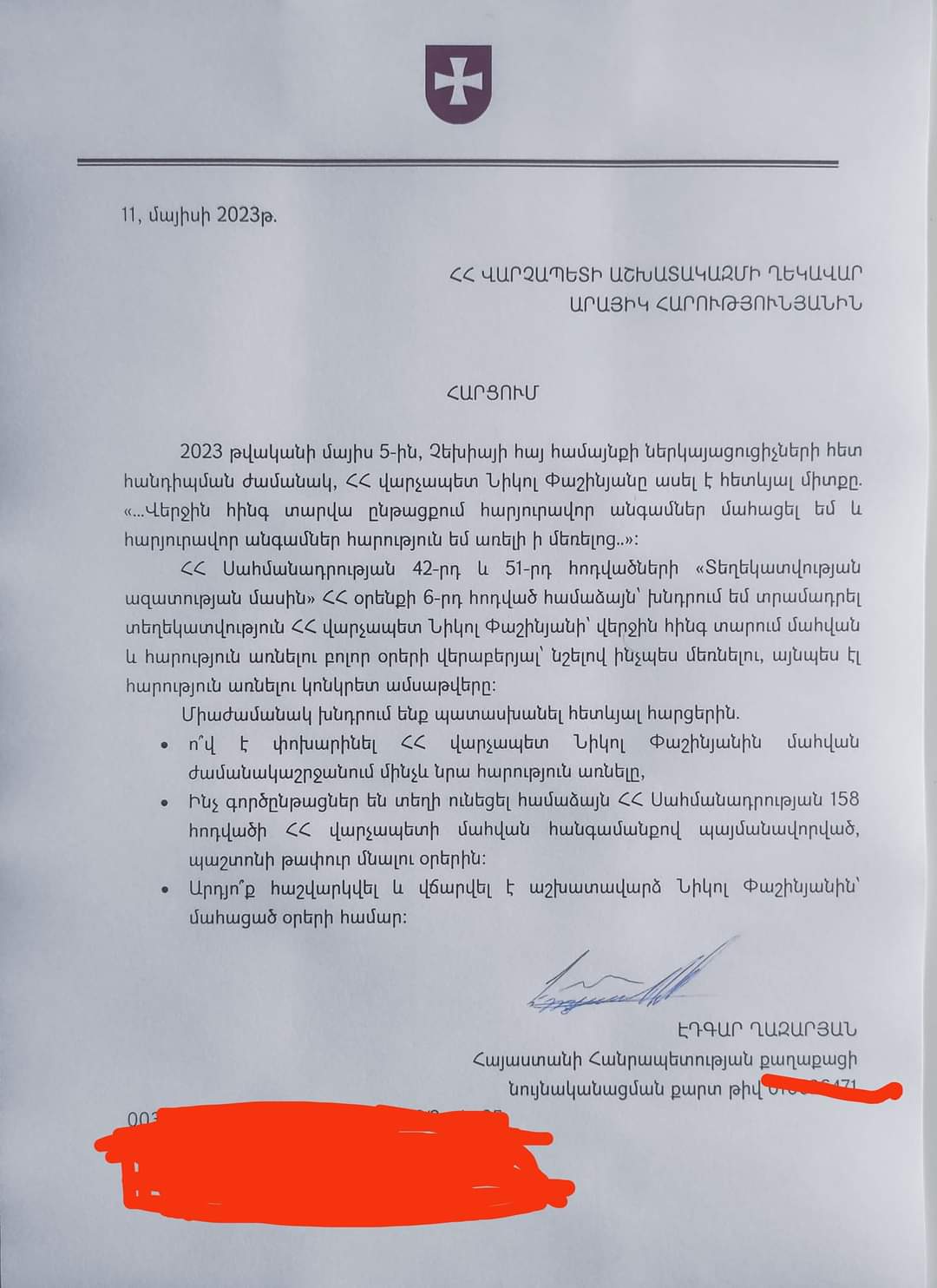 «Ո՞վ է փոխարինել Նիկոլ Փաշինյանին մահվան ժամանակաշրջանում՝ մինչև հարություն առնելը». Էդգար Ղազարյանը հարցում է ուղարկել վարչապետի աշխատակազմ. Լուսանկար