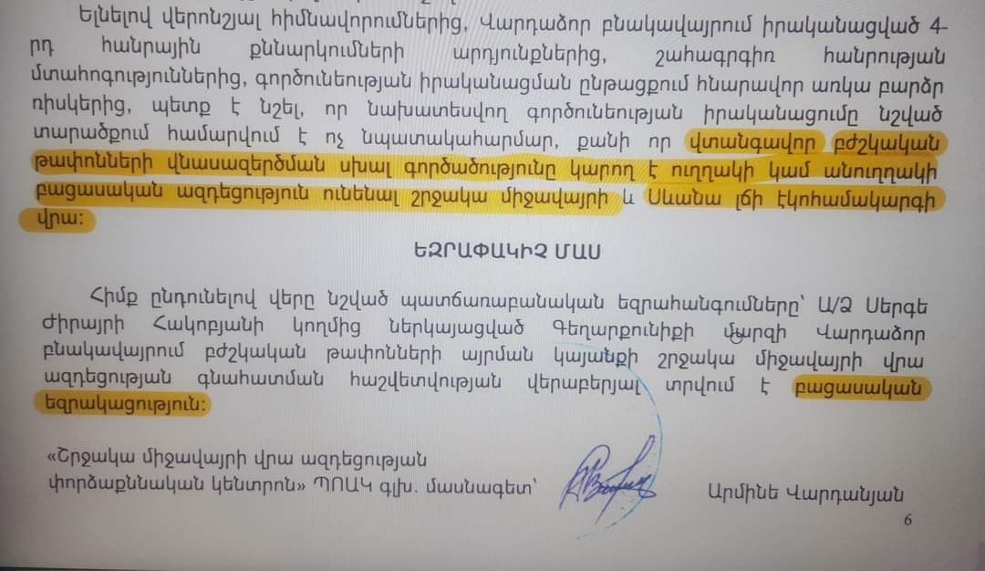 2021թվականից տարբեր քննարկումներ ու աշխատանքներ էին տանում Վարդաձոր համայնքում Բժշկական թափոնների այրման կայանքի կառուցման համար: Չնայած շահագրգիռ անձինք շատ հիմնավոր խաբում էին բնակիչներին ,որ այդ գործարանում այրվելու են միայն բժշկական խալաթներ, գտնվեցին բազմաթիվ հայրենասեր մարդիկ, որոնք պայքարեցին այդ <<աղտոտ>> ծրագրի դեմ: Տեղադրում եմ Շրջակա միջավայրի աղտոտվածության փորձաքննության եզրակացությունը: