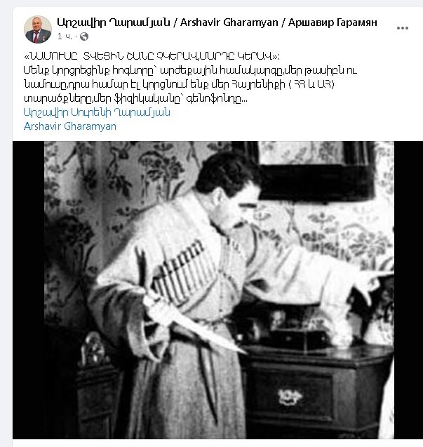 Արշավիր Ղարամյանը ֆեյսբուքյան իր էջում գրում է. «ՆԱՄՈՒՍԸ ՏՎԵՑԻՆ ՇԱՆԸ՝ ՉԿԵՐԱՎ, ՄԱՐԴԸ ԿԵՐԱՎ»: